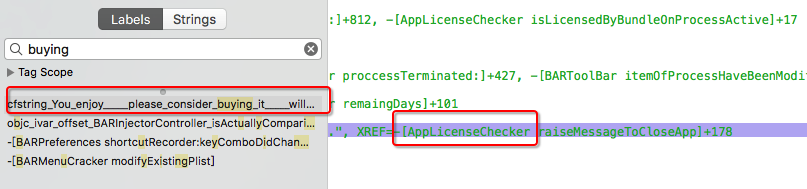Hopper搜索提示语里其中一个buying单词,发现有个AppLicenseChecker类: